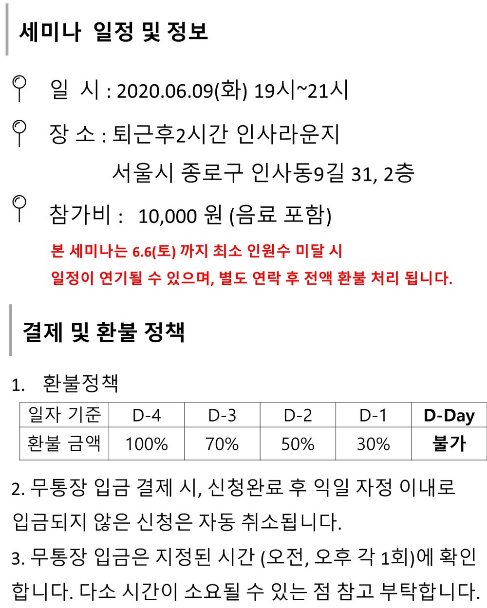 * 본 세미나는 마감되었습니다. 대기예약을 원하시면 "모임예약하기" 버튼으로 알람신청해주세요