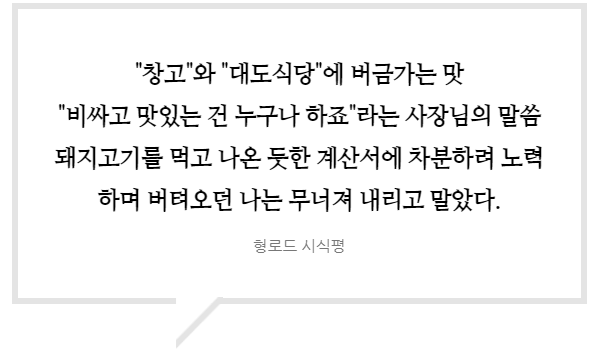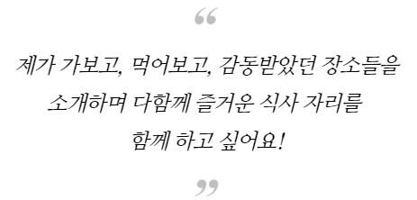 꼭 값 비싼 음식, 고급스러운 분위기, 질 좋은 식재료가 아니더라도 괜찮은 한 끼를 먹는다는것은 총체적인 경험의 과정이라 생각합니다. 음식의 맛, 식당의 분위기, 나 이외의 다른 손님들의 차림세, 말투, 그리고 함께하는 사람들과의 대화 등 괜찮은 식사자리만큼 즐거운 경험은 몇 없을것 같네요
